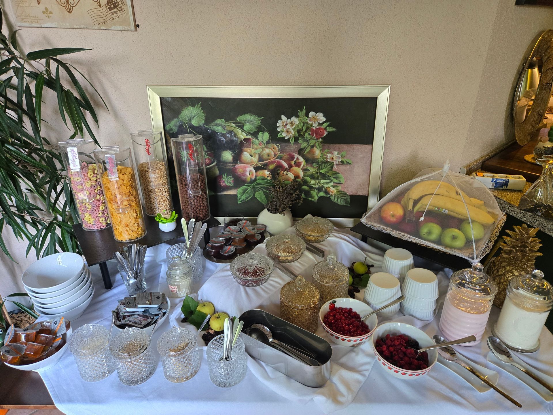 Buffet mit täglich frischen Brötchen, Wurst, Käse, Obst, Joghurt, Müsli, Eier, Säfte, u.v.m.,